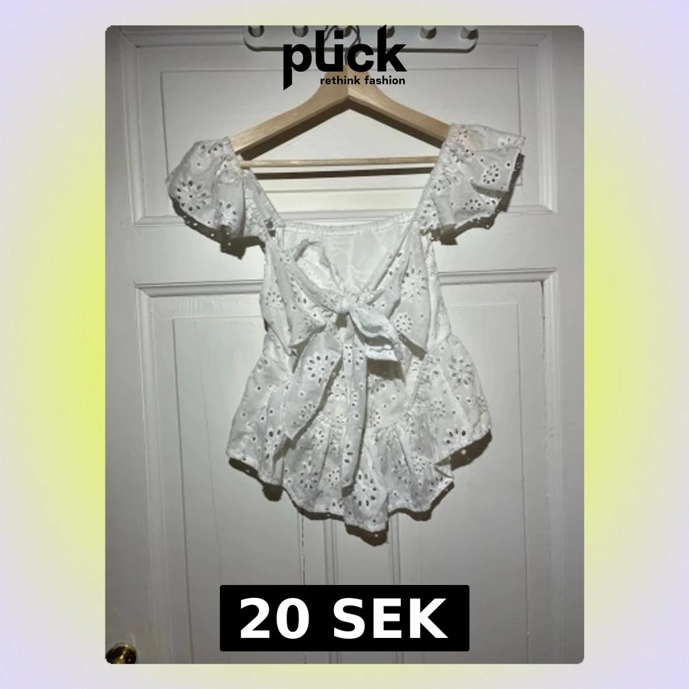 Söt vit blus med broderade blommor, volanger och knyt framtill. Offshoulder-modell med korta puffärmar och luftig passform. Perfekt för varma dagar och ger en romantisk vibe till din outfit.