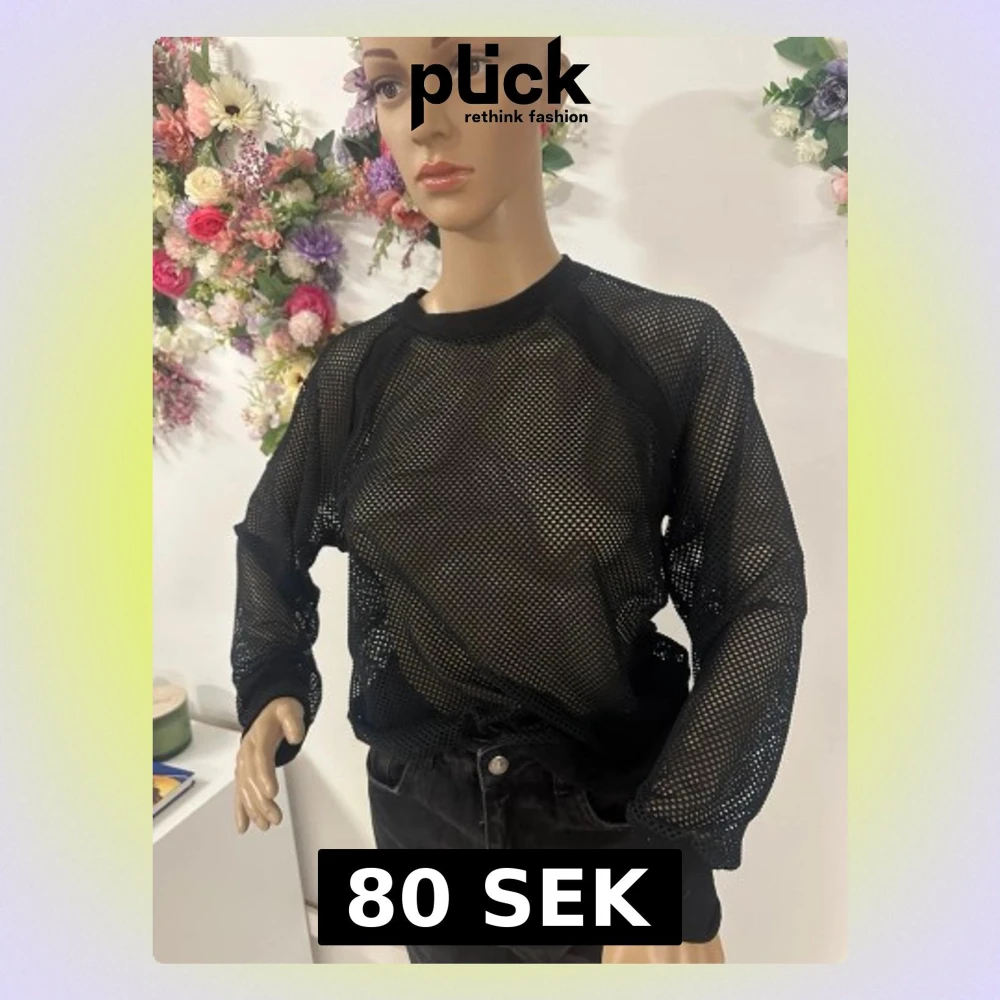 Säljer en svart långärmad mesh topp med rund halsringning. Toppen är helt genomskinlig med stora nätmaskor och har svarta kantband vid hals och ärmslut. Perfekt att styla lager på lager för en edgy look.