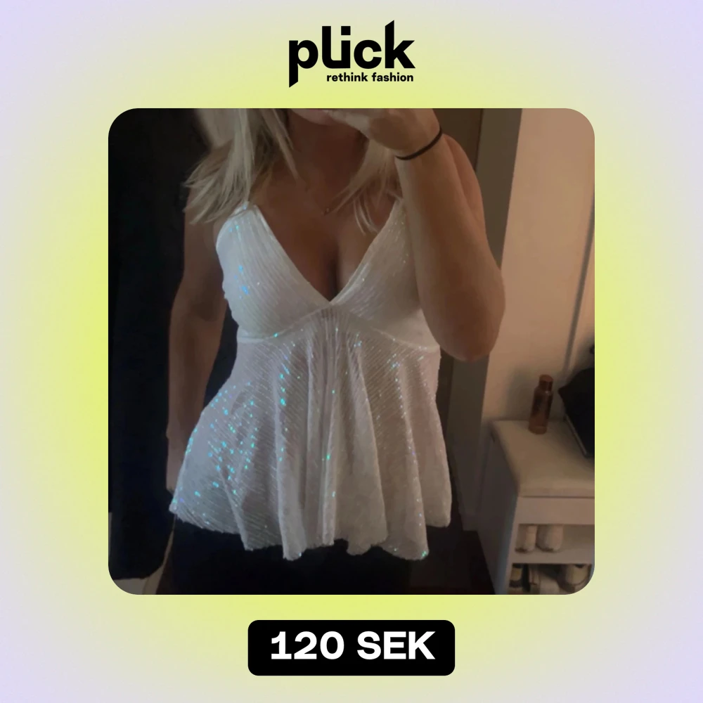 Säljer en superfin vit topp med glittriga detaljer som verkligen fångar ljuset. Den har en v-ringad design och smala axelband. Toppen är lite lösare i passformen och har en snygg snörning i ryggen. Perfekt för festliga tillfällen! ✨