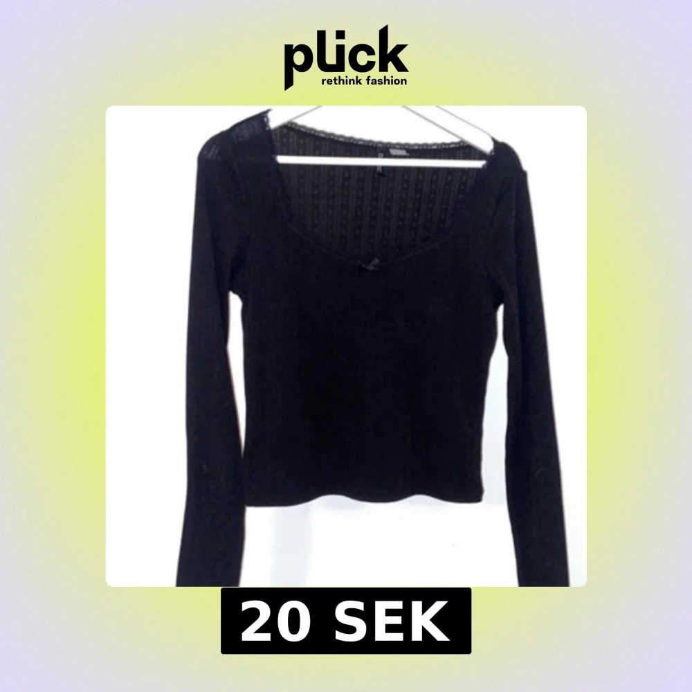 Supersöt svart långärmad blus från hm med diskret spetskant vid halsringningen och liten rosett framtill. Toppens tyg har ett subtilt mönster och är croppad i modellen. Perfekt för dig som gillar stilrena och feminina detaljer.