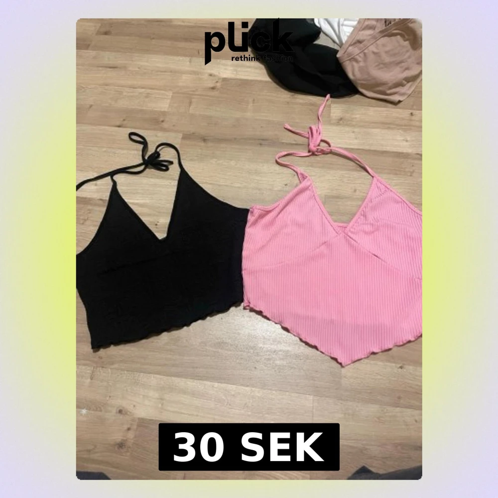 Två croppade linne-toppar med smala axelband och v-ringning. En svart topp med broderat blommönster och en rosa ribbad topp med spetsig nederkant. Båda har knyt i nacken och är perfekta för sommaren. Den svarta har en skada som visas på bilden
