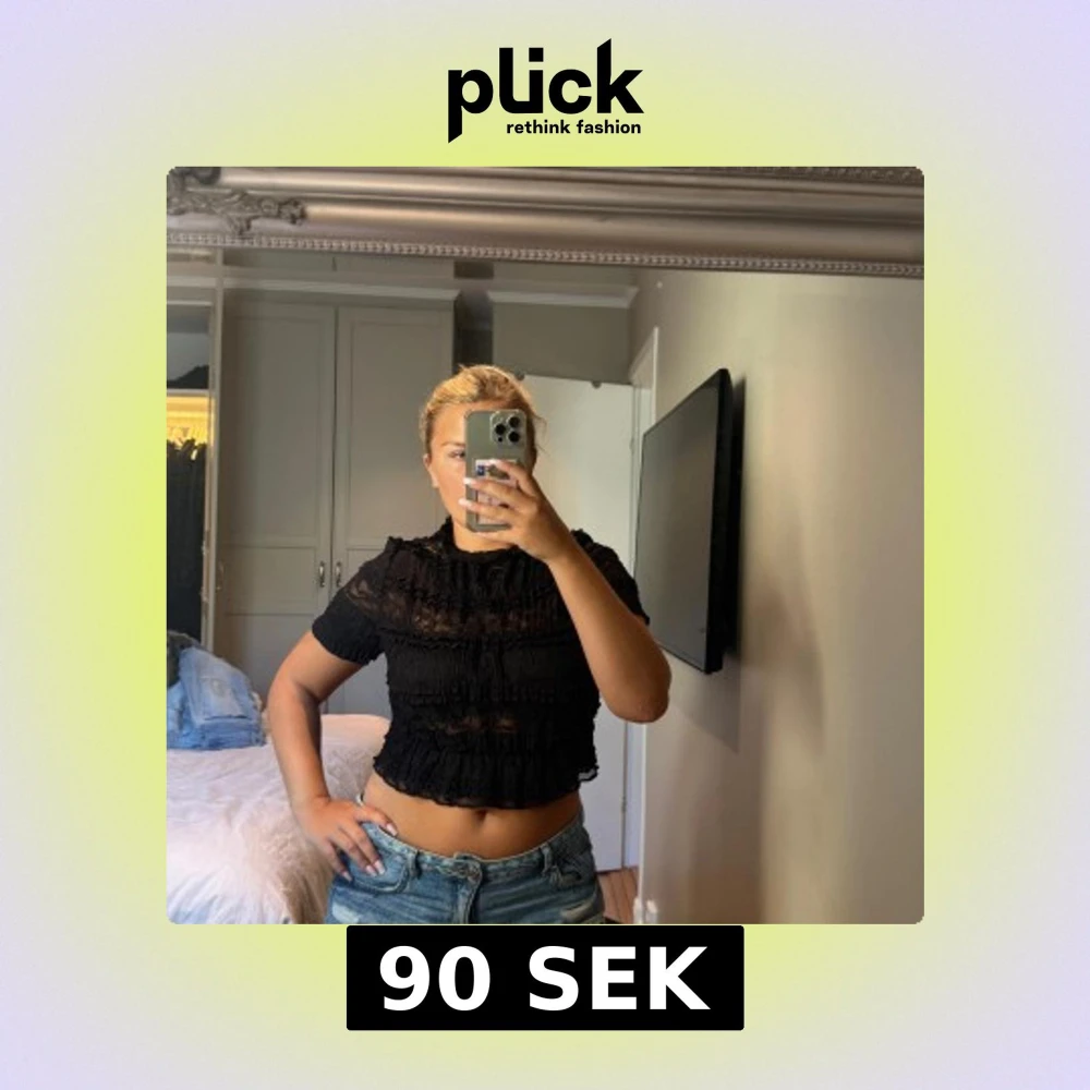 Supersöt svart blus med kort ärm, croppad passform och massor av volanger. Hela toppen är i genombruten spets med små rynkade detaljer och hög hals. Perfekt för dig som gillar romantisk och trendig stil. Aldrig använt