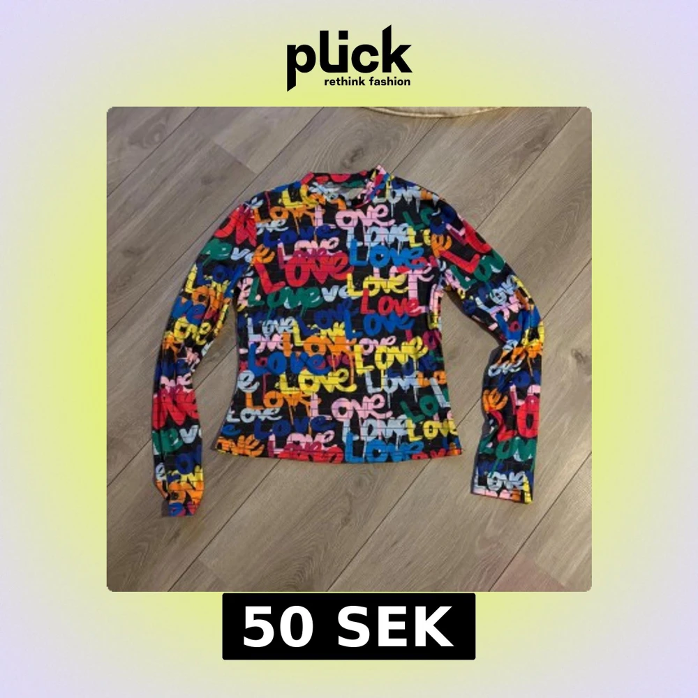 Säljer en supercool långärmad topp med färgglatt tryck där det står 'Love' i olika färger som blå, röd, gul, rosa, orange och grön. Toppen har en rund hals och är figurnära i modellen. Stretchigt material