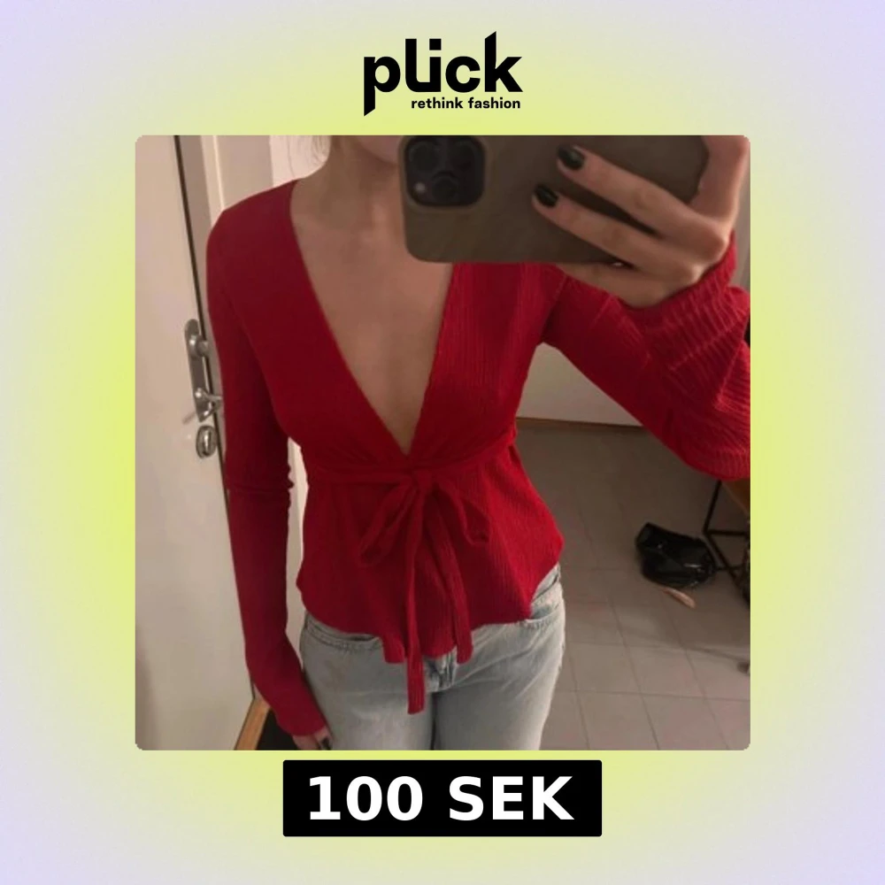 Säljer en snygg röd omlottopp med djup v-ringning och långa ärmar. Toppen har ett ribbat tyg och knytband i midjan som ger en schysst siluett. Perfekt för dig som gillar färg och vill sticka ut lite extra.