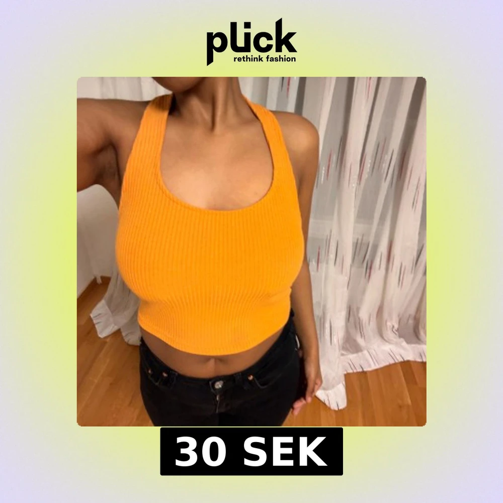 Snygg orange ribbad linnetopp med halterneck-design. Perfekt för varma dagar och ger en trendig look. Toppen är croppad och framhäver midjan på ett stilrent sätt.