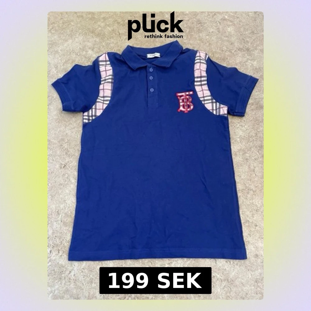 Snygg blå pikétopp från Burberry med klassiska rutiga paneler i beige, svart och rosa på axlarna. Toppen har korta ärmar, krage med knappar och ett rött broderat TB-märke på bröstet. Perfekt för en trendig och avslappnad stil.