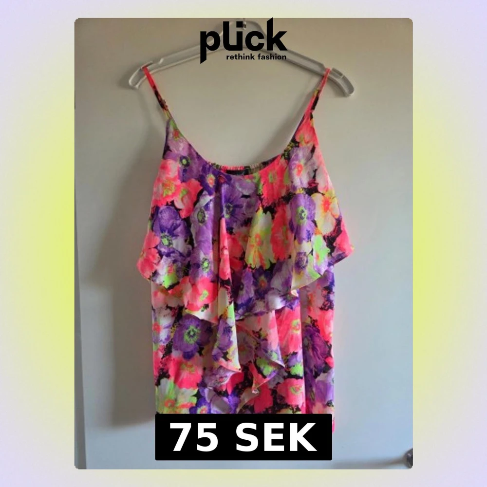 Färgstark linnetopp med blommigt mönster i rosa, lila, gul och grön. Toppen har tunna axelband, volangdetaljer framtill och är ärmlös. Materialet känns lätt och luftigt, perfekt för varma dagar.