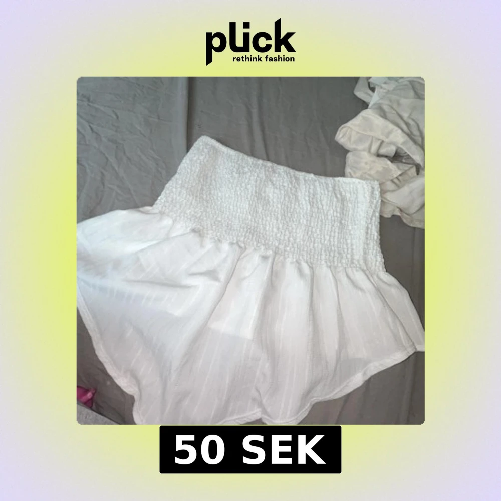Supersöt vit topp med bred smockad midja som sitter skönt och ger en snygg siluett. Kjolen har ett lätt, luftigt tyg med subtila ränder och volangkant nedtill. Perfekt för varma dagar och enkel att matcha med