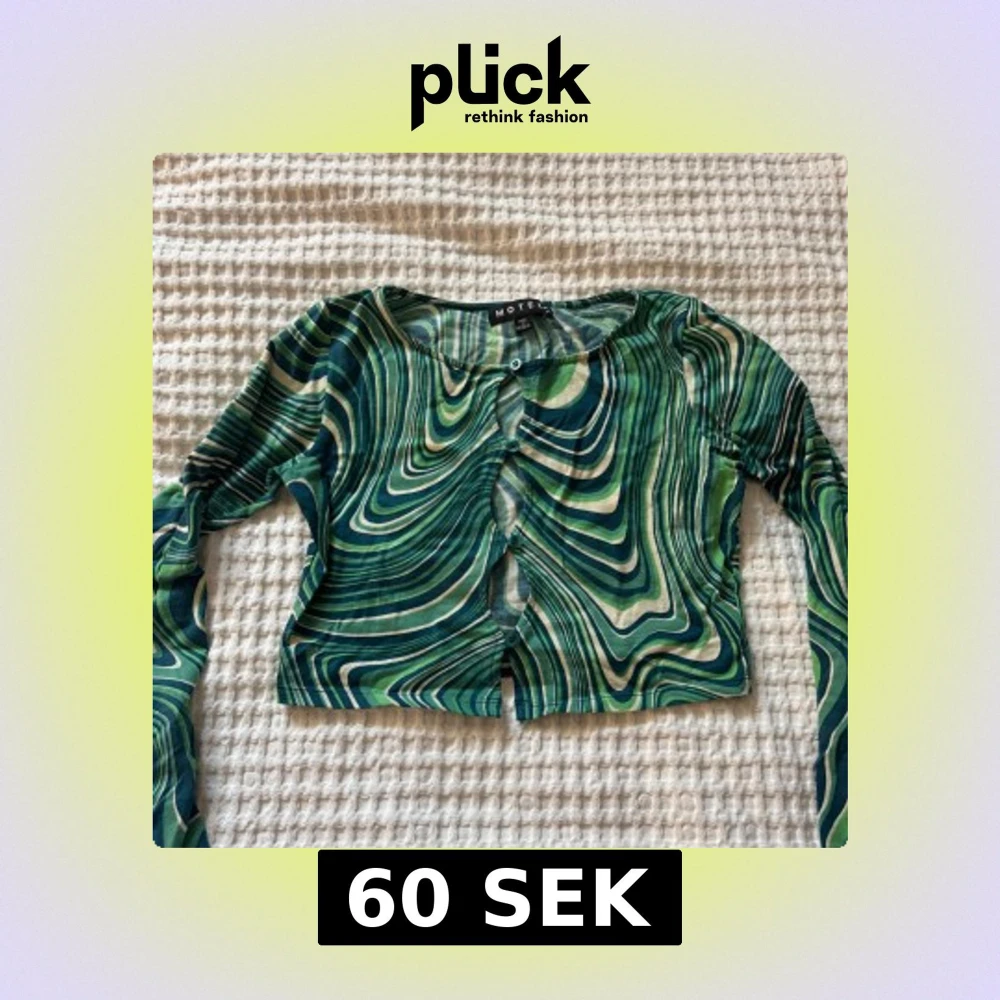 Säljer en färgstark topp från Motel i gröna och vita vågiga mönster. Blusen har lång ärm, croppad passform och knappar framtill. Perfekt för dig som gillar unika plagg med retrovibbar!