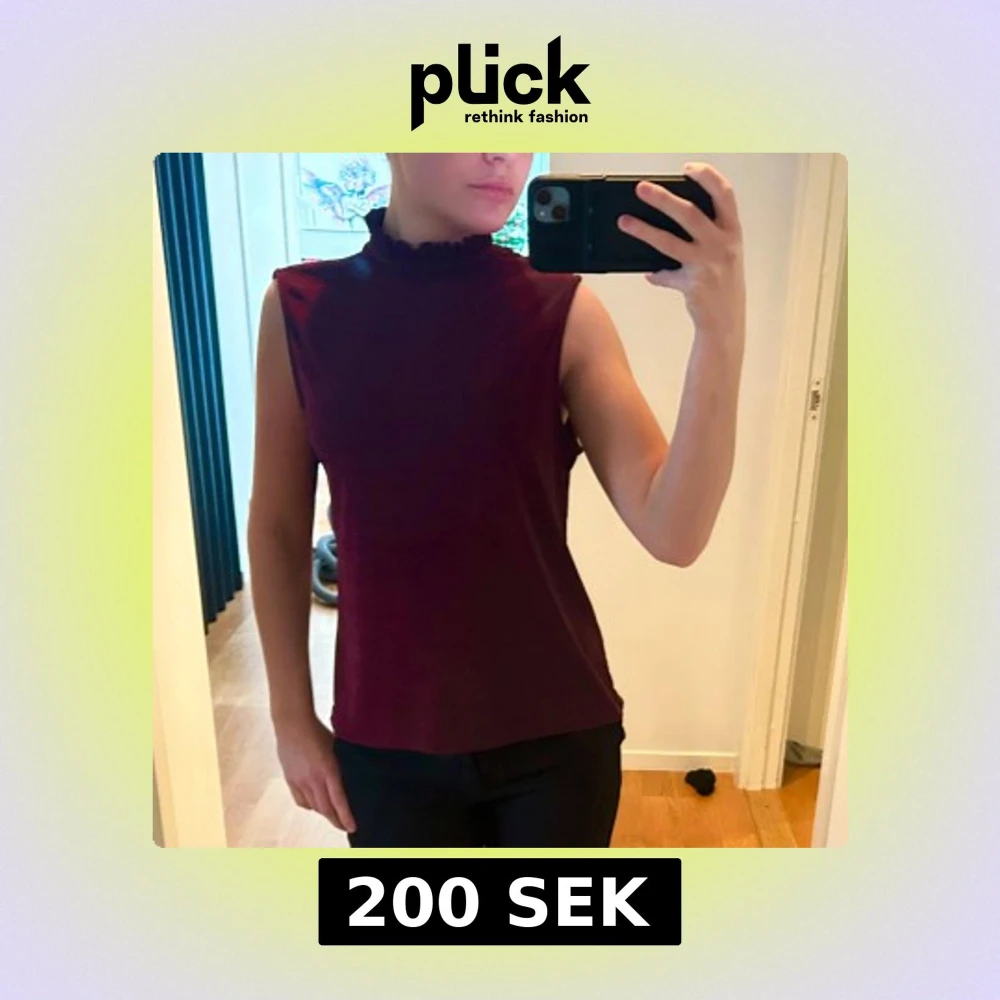 Snygg vinröd ärmlös topp med hög krage och en liten öppning i ryggen. Perfekt för en stilren look. Är i M men passar många. Jag har vanligtvis s