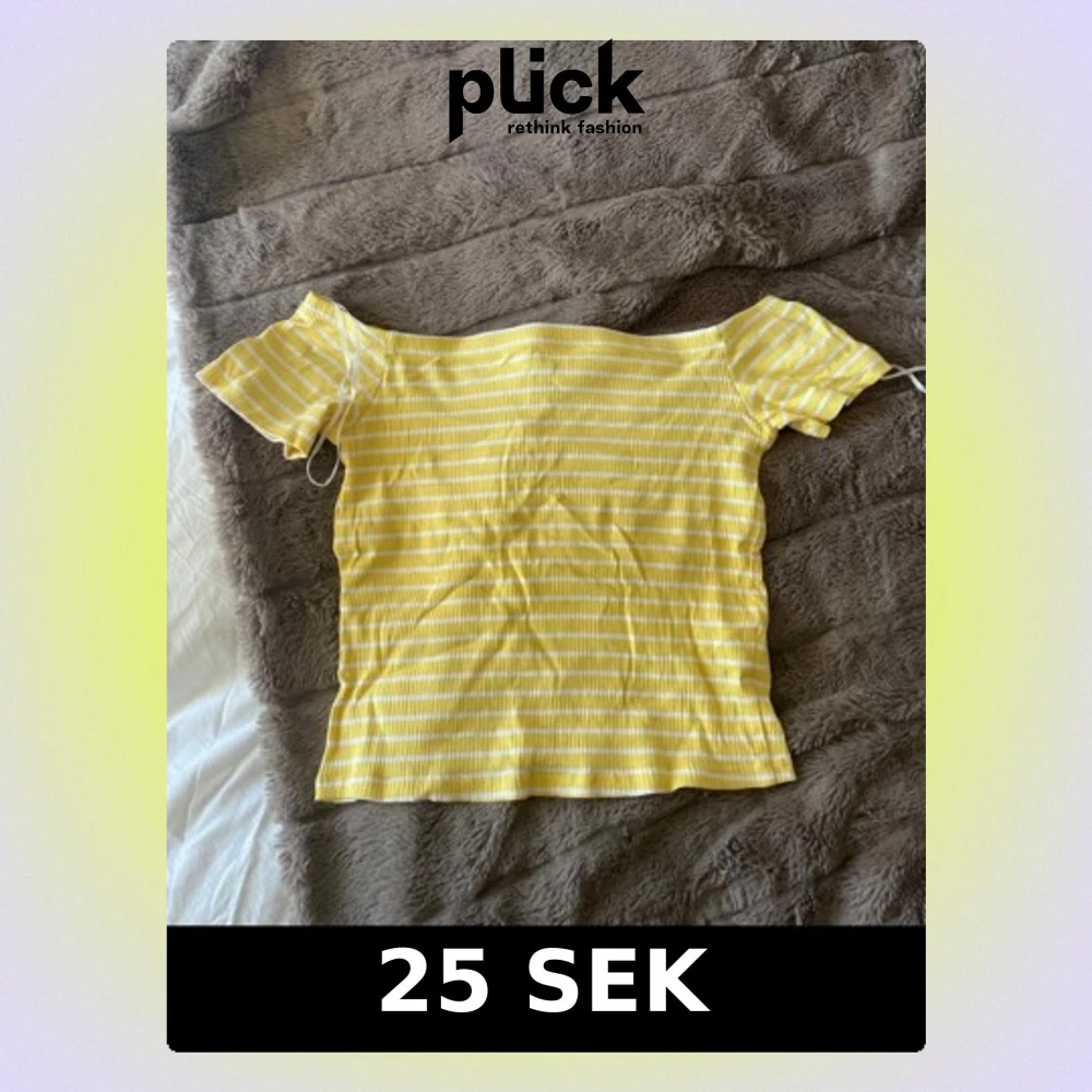 Säljer en söt gul och vit randig topp från H&M Divided i storlek M. Modellen är offshoulder med korta ärmar och ribbad struktur. Perfekt för varma dagar och har en fräsch, ungdomlig vibe.