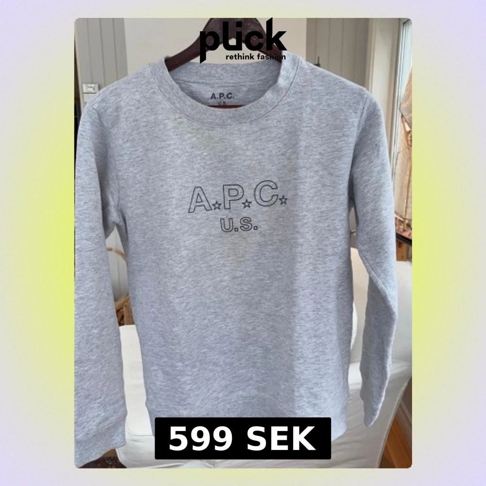 Säljer en stilren grå sweatshirt från A.P.C. U.S. med svart broderad logga och stjärndetaljer på bröstet. Tröjan har rund halsringning och långa ärmar. Perfekt för en avslappnad och trendig look.