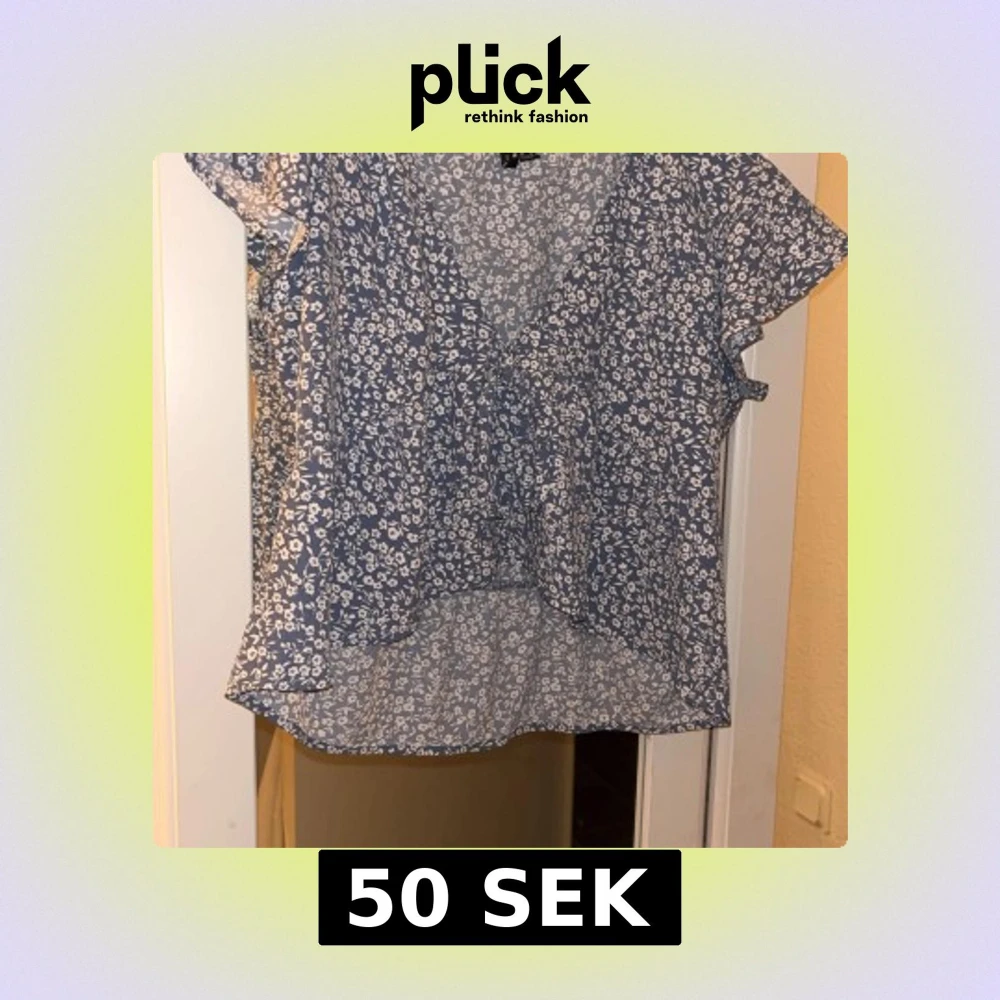 Söt blå blus med vita blommor och korta ärmar. Blusen har en v-ringad design med knytning framtill och är lätt och luftig, perfekt för varmare dagar. Den har varit använd ett par gånger