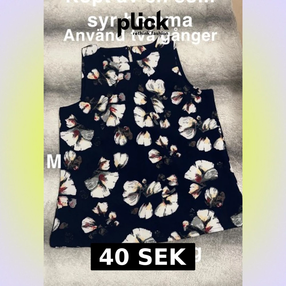 Snygg ärmlös linnetopp i marinblått med stora blommiga mönster i vitt, beige och rött. Toppen har rak passform och rund halsringning. Perfekt för dig som gillar unika plagg med färg och mönster.🌸Köpt av en som syr så står inga lappar. Köpt som stl M. Använd två gånger
