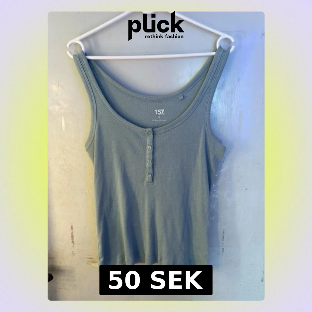 Två ribbade linnetoppar , en i ljusgrön och en i mörkblå färg. Båda har rund halsringning och dekorativa knappar framtill. Perfekta för sommaren och lätta att matcha med olika outfits. (Båda för 50 kr)