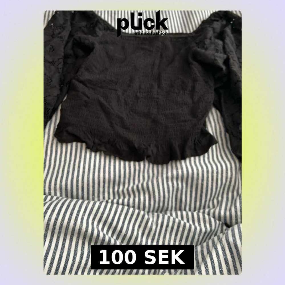 Trendig svart croppad topp med långa spetsärmar och smockad kropp. Toppen har volangkant nedtill och en snygg offshoulder-look. Perfekt för dig som vill ha en stilren men ändå detaljrik topp till din outfit.