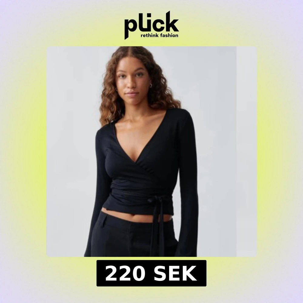 Snygg svart omlottopp med långa ärmar och knytband i midjan. Toppen har en djup v-ringning och är figurnära.