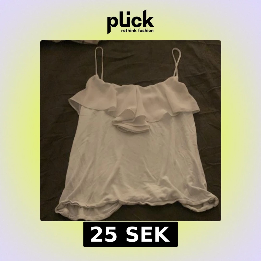 Säljer en söt vit linnetopp med smala axelband och volangdetalj framtill. Perfekt för varma sommardagar eller som ett lager under en kavaj. Toppen har en luftig och bekväm passform. Det står att det är L men passar som M/S💗 Använd 5-6 gånger inga fläckar
