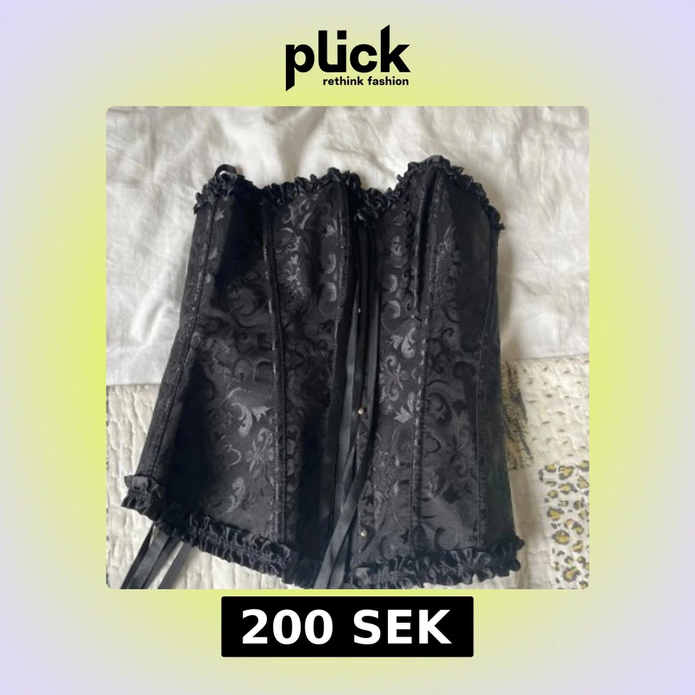 Säljer en svart korsett i storlek M med snyggt blommigt mönster och dekorativa volanger längs kanterna. Korsetten har snörning både fram och bak samt är gjord i polyester med lite stretch. Perfekt för dig som vill ha en edgy och cool look.