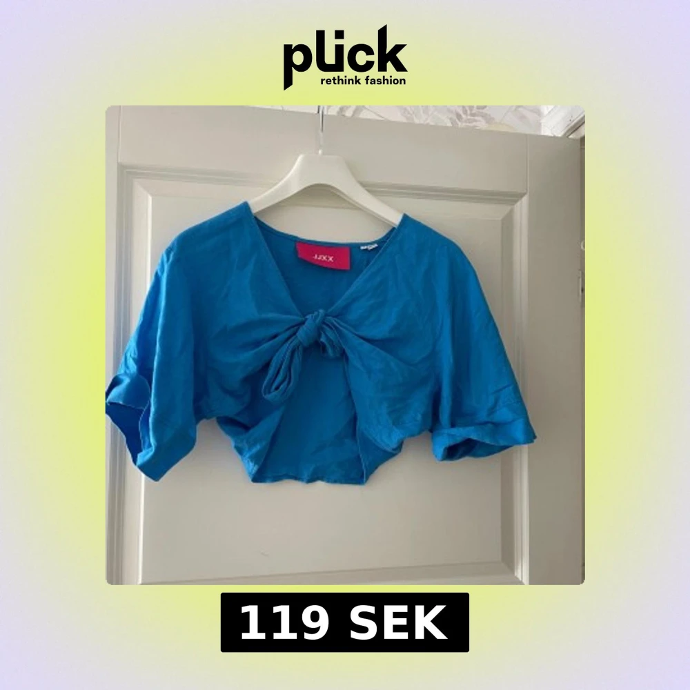 Säljer en blå croppad bolerotopp från JJXX med knyt framtill. Toppen har korta, vida ärmar och är gjord i mjuk bomull. Perfekt för att ge outfiten en färgklick och cool vibe.
