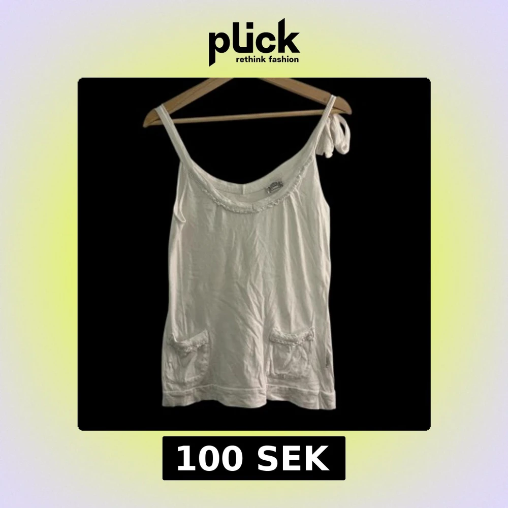 Säljer en söt vit linnetopp från Morgan med smala axelband, varav det ena har en knyt-detalj. Toppen har två små fickor framtill med volangkant och dekorativt band.