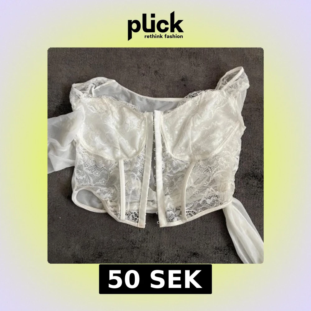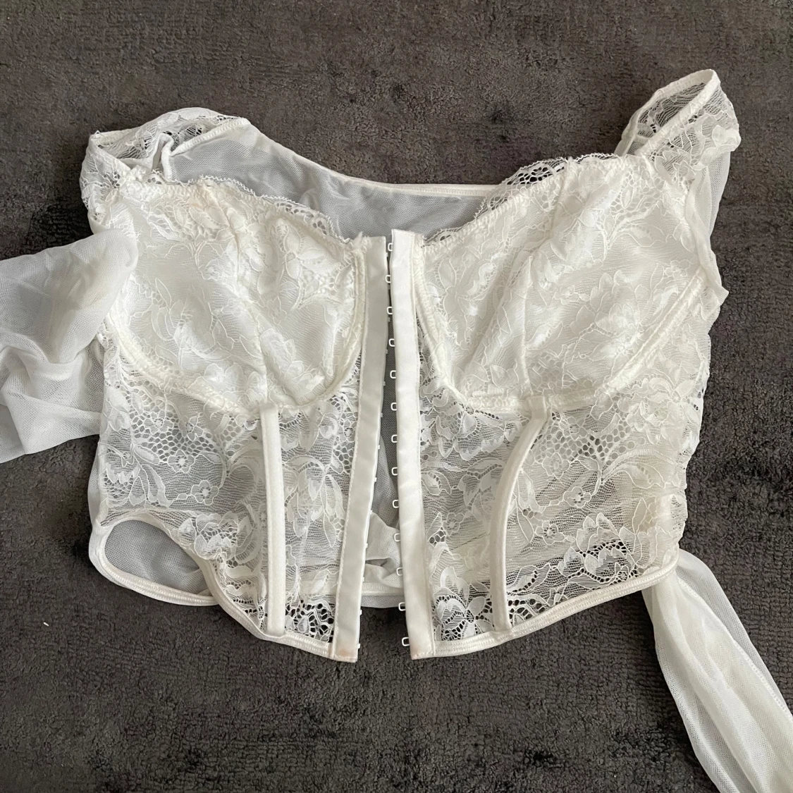 Säljer en vit korsettopp med spetsdetaljer och genomskinliga partier. Toppen har axelband och knäppning framtill. Perfekt för att skapa en romantisk och trendig look.