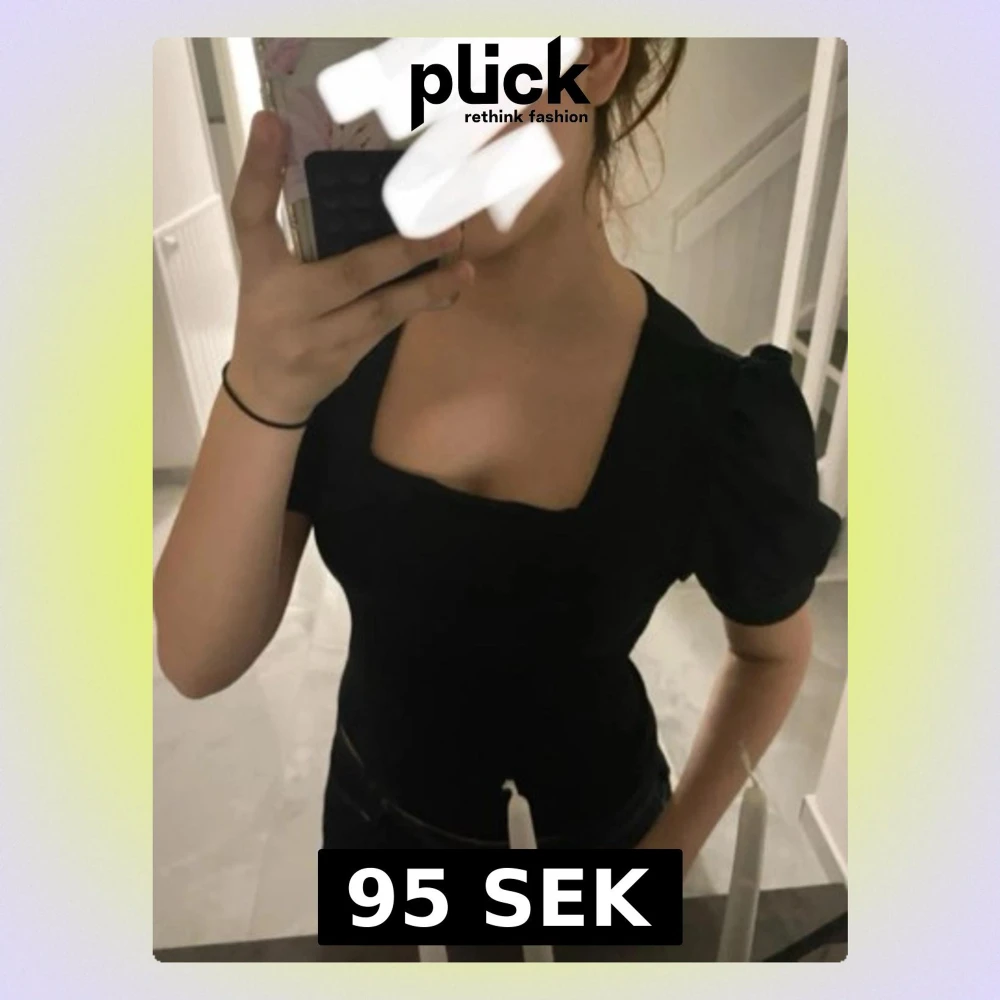 Snygg svart topp med puffärmar och en trendig fyrkantig ringning. Modellen är figurnära och passar perfekt till jeans eller kjol. Toppens material känns mjukt och stretchigt, vilket gör den bekväm att bära hela dagen.