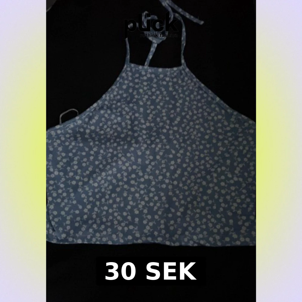 Blå topp med vita små blommor och knytband i nacken. Croppad passform. Är en lös tråd längst ut på ena snöret. Stl M från SHEIN.