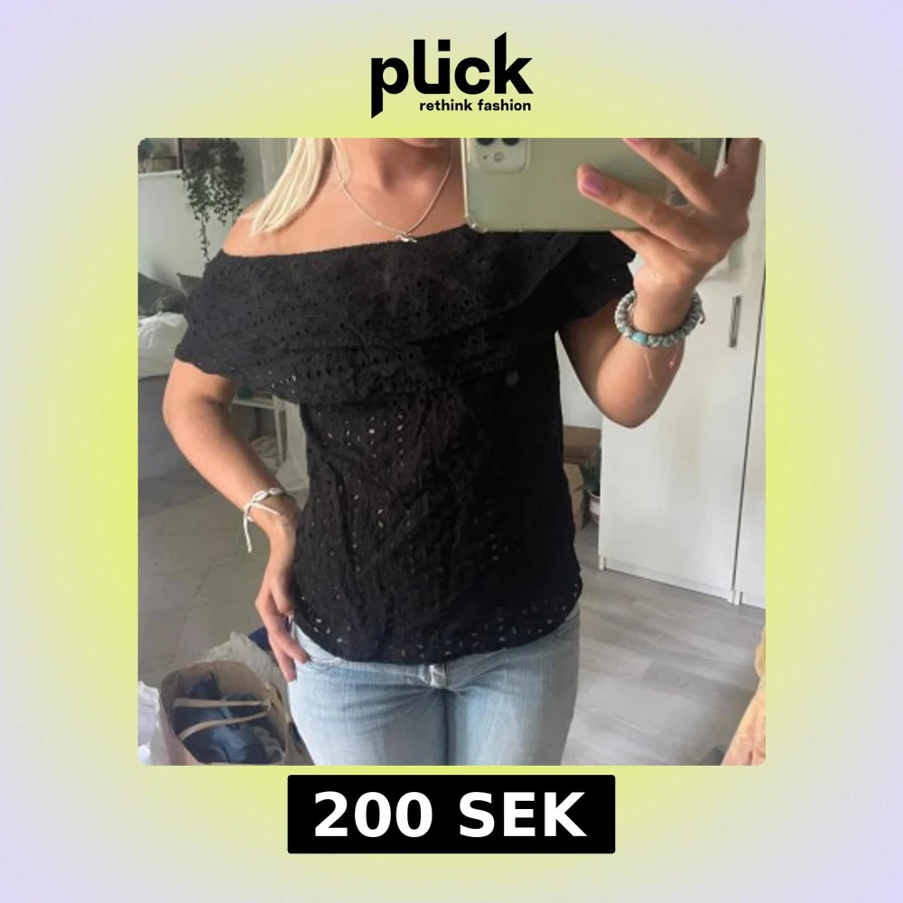 Säljer en svart offshoulder blus med snygga spetsdetaljer och hålmönster. Blusen har en bred volang upptill som ger en cool och feminin vibe. Perfekt för dig som gillar att sticka ut med detaljer och älskar svart. Passar till jeans eller kjol för en trendig look.