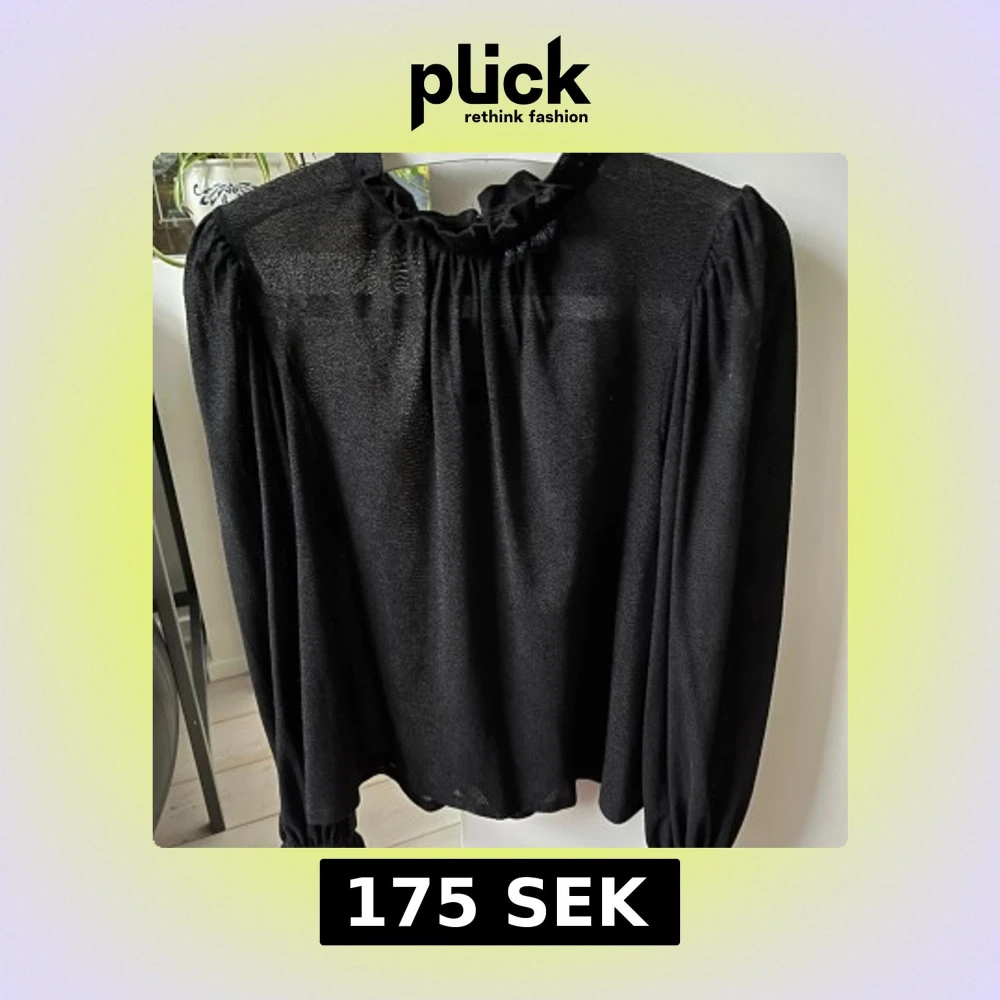 Säljer en svart blus i transparent mesh med volangkrage och långa puffiga ärmar. Blusen har diskret prickig struktur i tyget och resår vid ärmsluten för en snygg siluett. Perfekt för dig som gillar trendiga detaljer och en luftig känsla.
