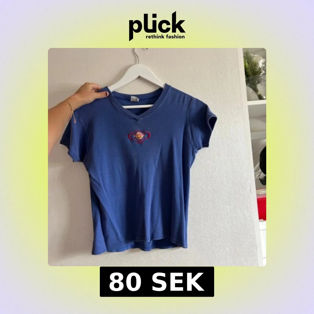 Säljer en blå Hard rock café t-shirt med v-ringning. Storleken är onesize och sitter bra på mig som är M. Stretchigt material🤩