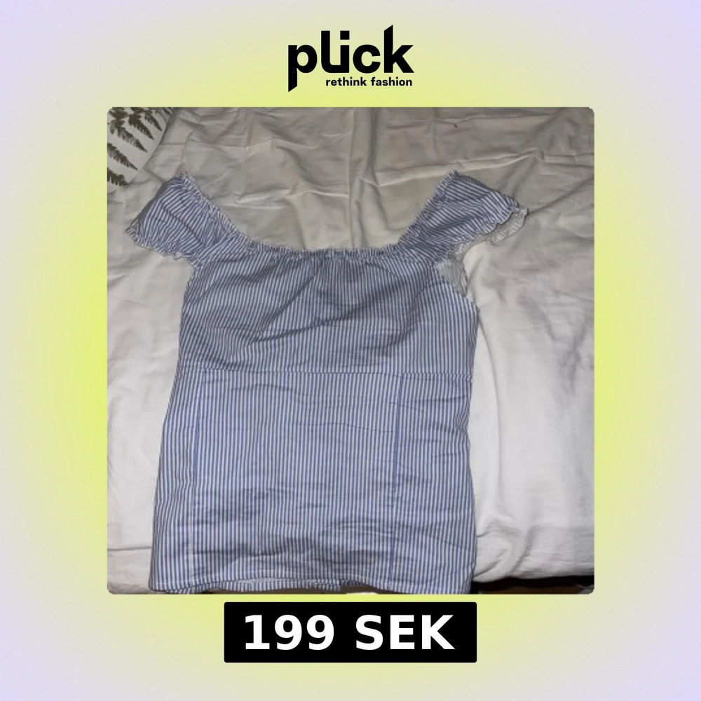Säljer en söt blus från Subdued i storlek M. Blusen är blårandig med vita knappar framtill, har offshoulder-ärmar med volangkant. Materialet är mjukt och känns som bomull.