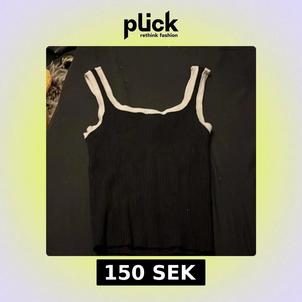 Snygg svart ribbad linnetopp från H&M Divided med vita kontrastkanter runt axelband och halsringning. Toppen är ärmlös och har en croppad passform som ger en trendig look. Perfekt att matcha med jeans eller kjol för en cool stil.
