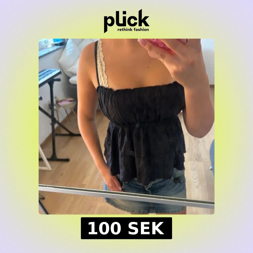 Säljer en mörkblå topp med smala axelband och volang nedtill. Toppen har en luftig passform. Perfekt för varma dagar! 💘