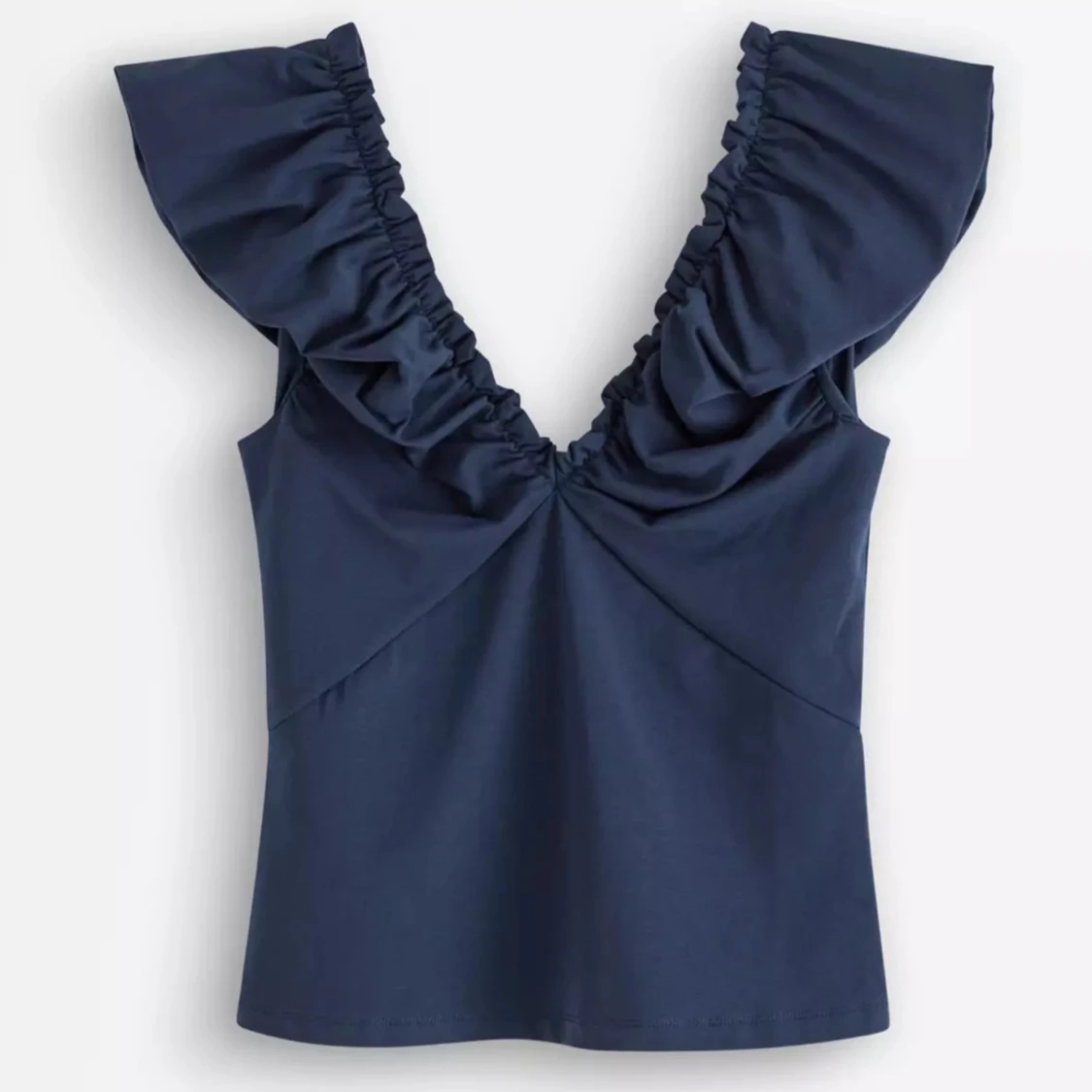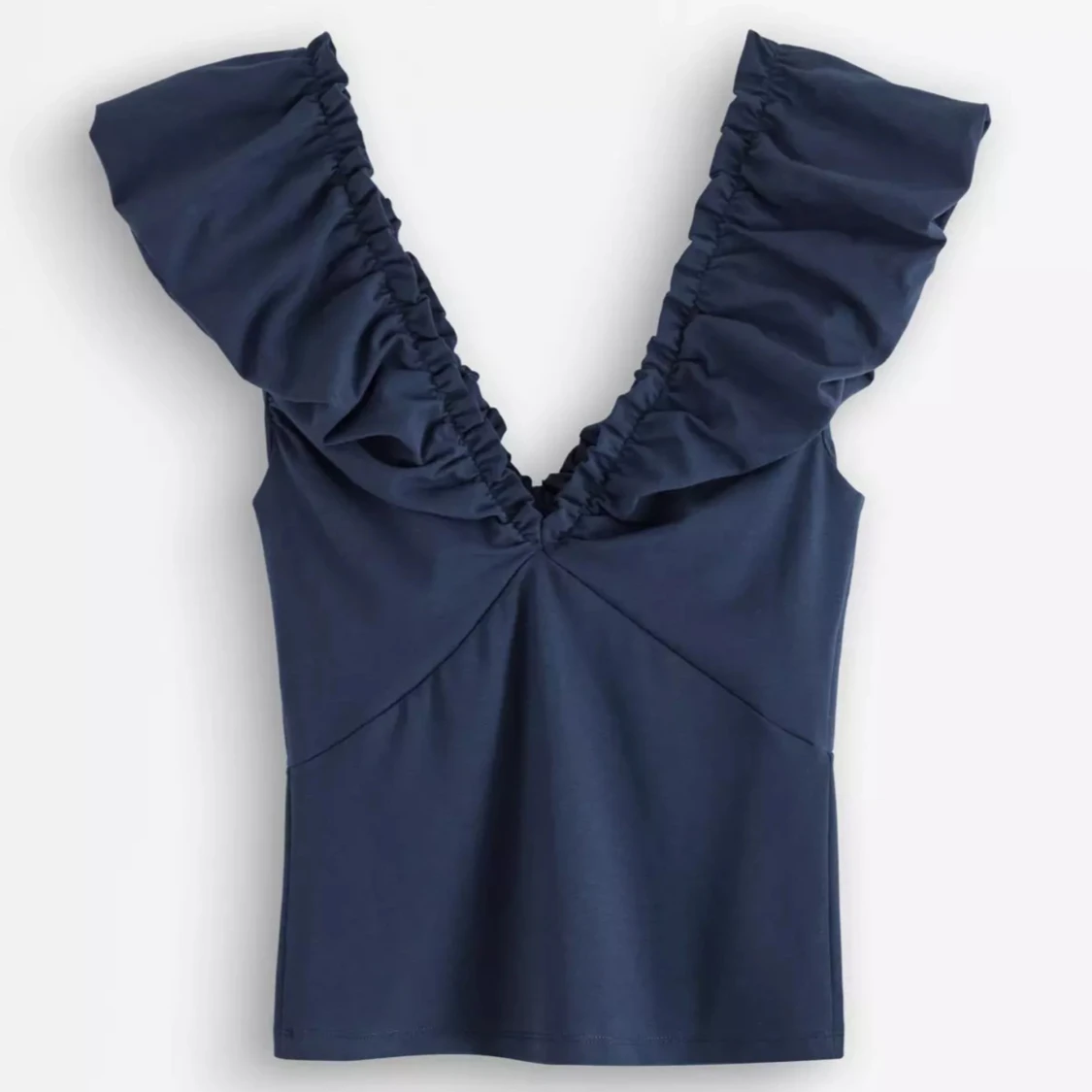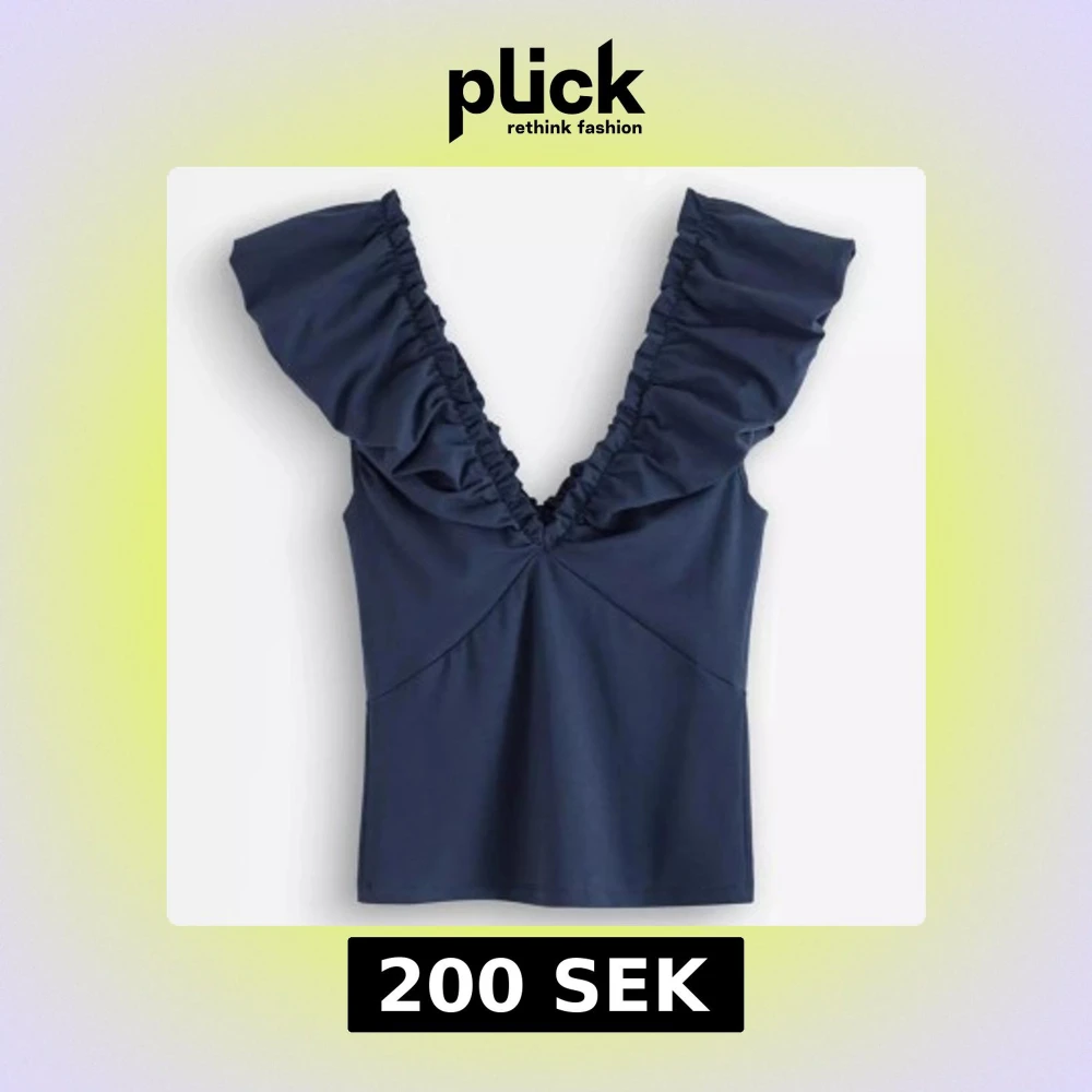 Supersnygg mörkblå topp med djup v-ringning och volanger längs axlarna. Helt ny, org pris; 299kr 💗