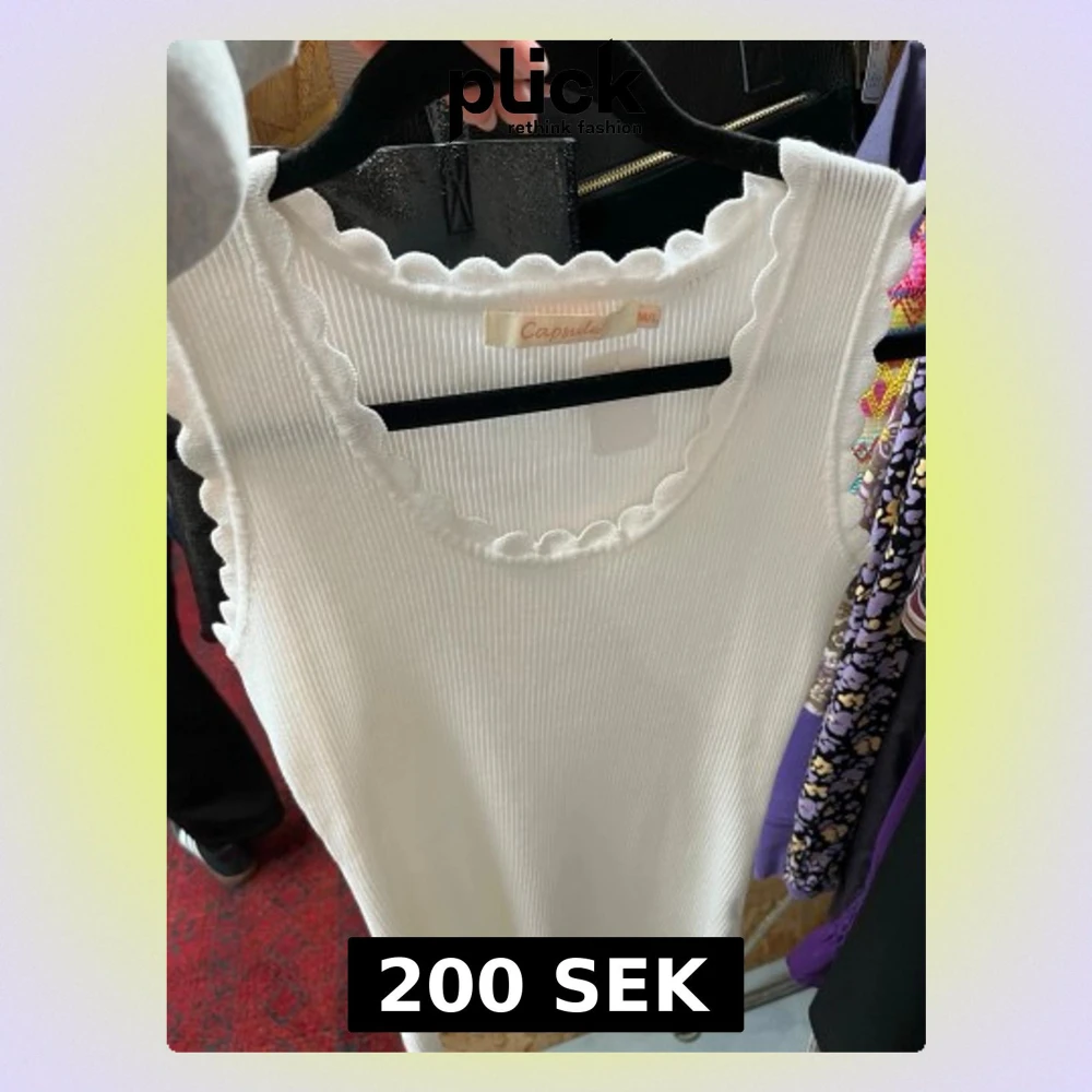 Säljer en vit ribbad linnetopp från Capsule med vågiga kanter vid halsringning och ärmhål. Toppen är ärmlös och har en mjuk, stretchig passform som känns både trendig och bekväm. Perfekt att styla med jeans eller kjol för en fräsch look.
