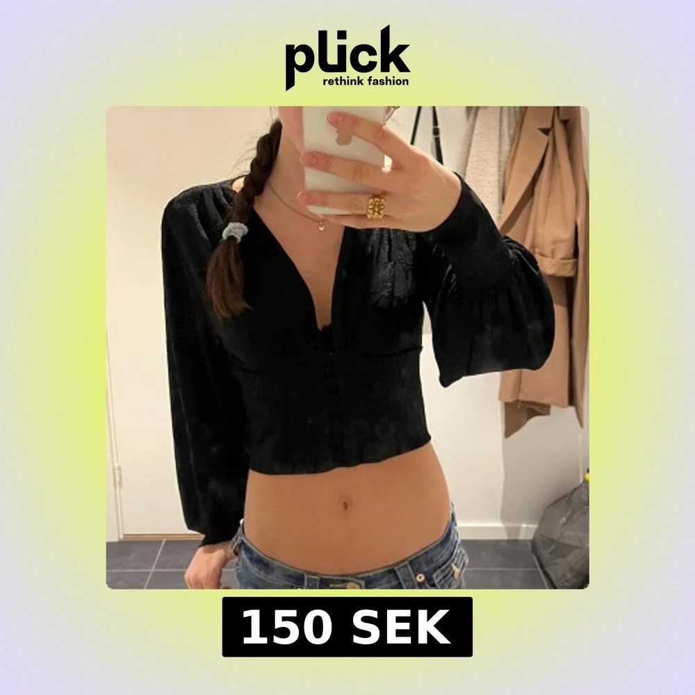 Säljer en svart croppad blus med djup v-ringning och långa puffärmar. Toppen har knappar framtill och ett diskret blommigt mönster i tyget som ger en snygg textur. Perfekt för dig som gillar stilrena och trendiga plagg med lite extra detaljer.