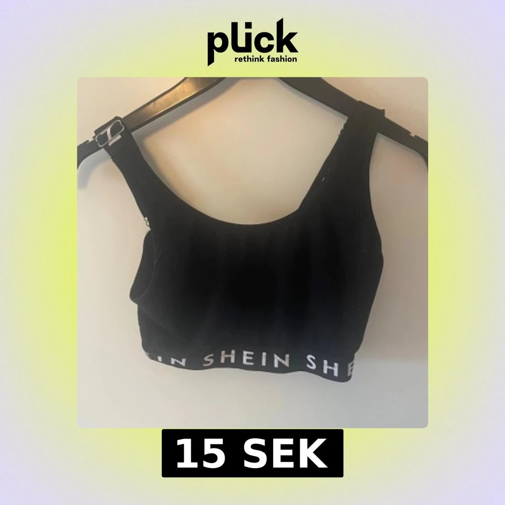 Svart croppad topp från SHEIN med breda axelband och resår nertill, båda med vit SHEIN-logga. Toppen är ärmlös och har justerbara spännen på axelbanden. Materialet är en mix av bomull och polyester för en bekväm känsla.