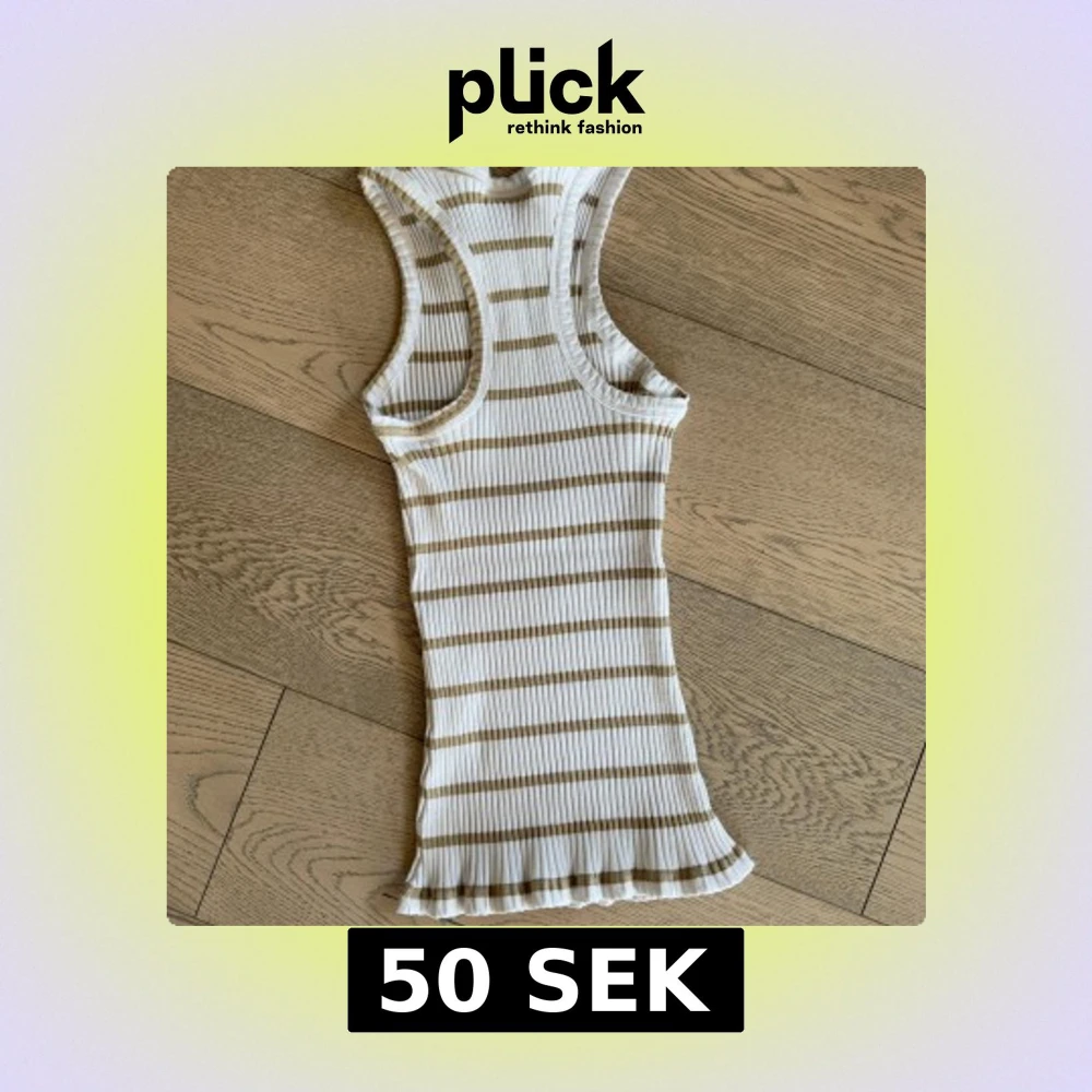 Säljer en ribbad linnetopp från Twist & Tango i vitt och beige med horisontella ränder. Modellen är ärmlös med rund halsringning och figurnära modell.