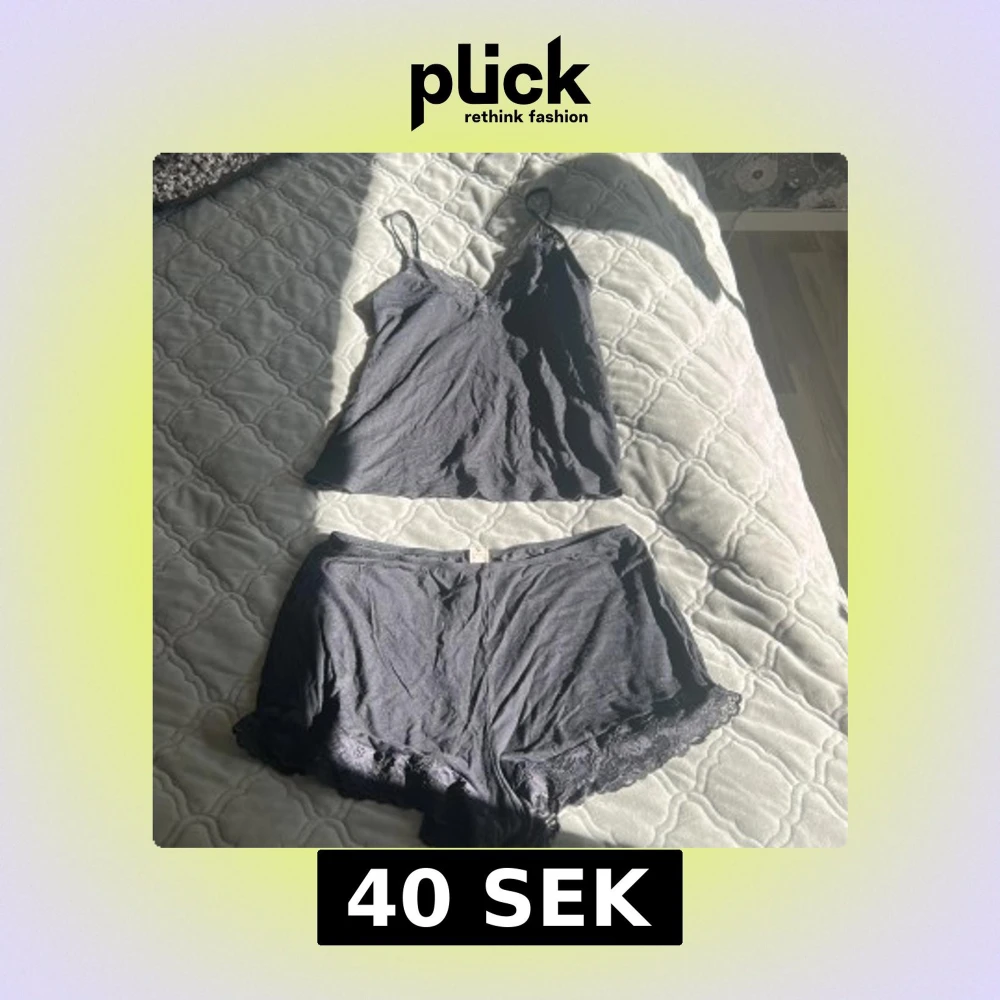 Svart linnetopp med tunna axelband och v-ringning, dekorerad med spets längs urringningen. Tillverkad i mjukt och lätt material, perfekt för en chill look. Matchande shorts med spetskant ingår.