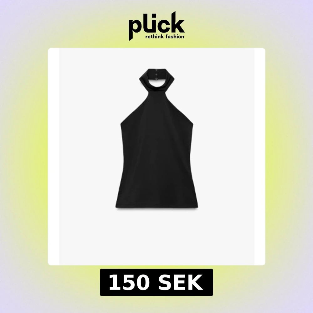 Snygg svart halterneck topp med hög hals och knäppning bak. Toppen är ärmlös och har en stilren, minimalistisk design som passar perfekt till jeans eller kjol. Materialet känns mjukt och följsamt mot huden.