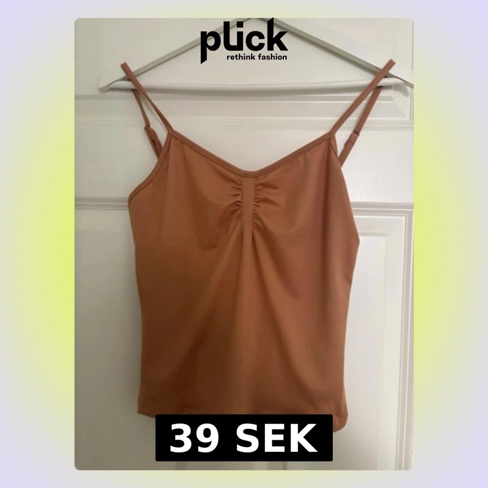 Säljer en beige croppad linnetopp med smala axelband och snygg rynkdetalj framtill i storlek M.
