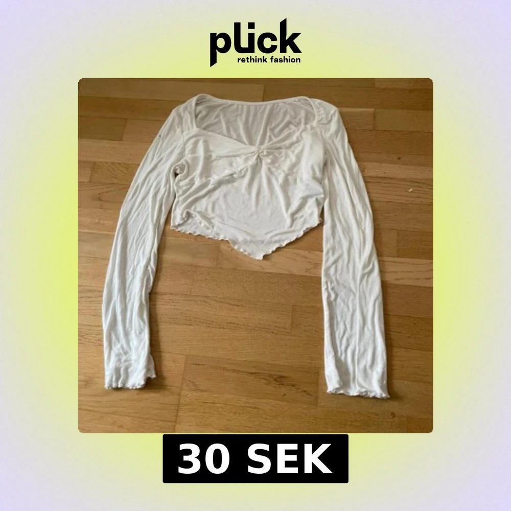 Säljer en vit långärmad topp med croppad passform och v-ringning. Toppen har twistad detalj framtill och vågig kant nertill som ger en snygg touch. Perfekt att styla med jeans eller kjol för en trendig look.