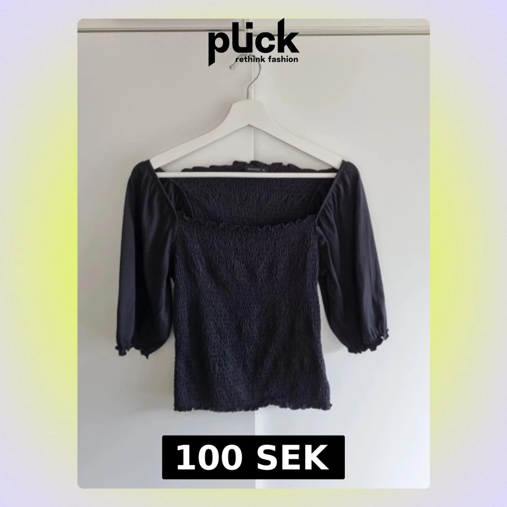 Trendig svart topp med smockad kropp och puffiga trekvartsärmar. Fyrkantig ringning och elastiska ärmslut ger en snygg och bekväm passform. Perfekt till jeans eller kjol för en cool look. Fint skick
