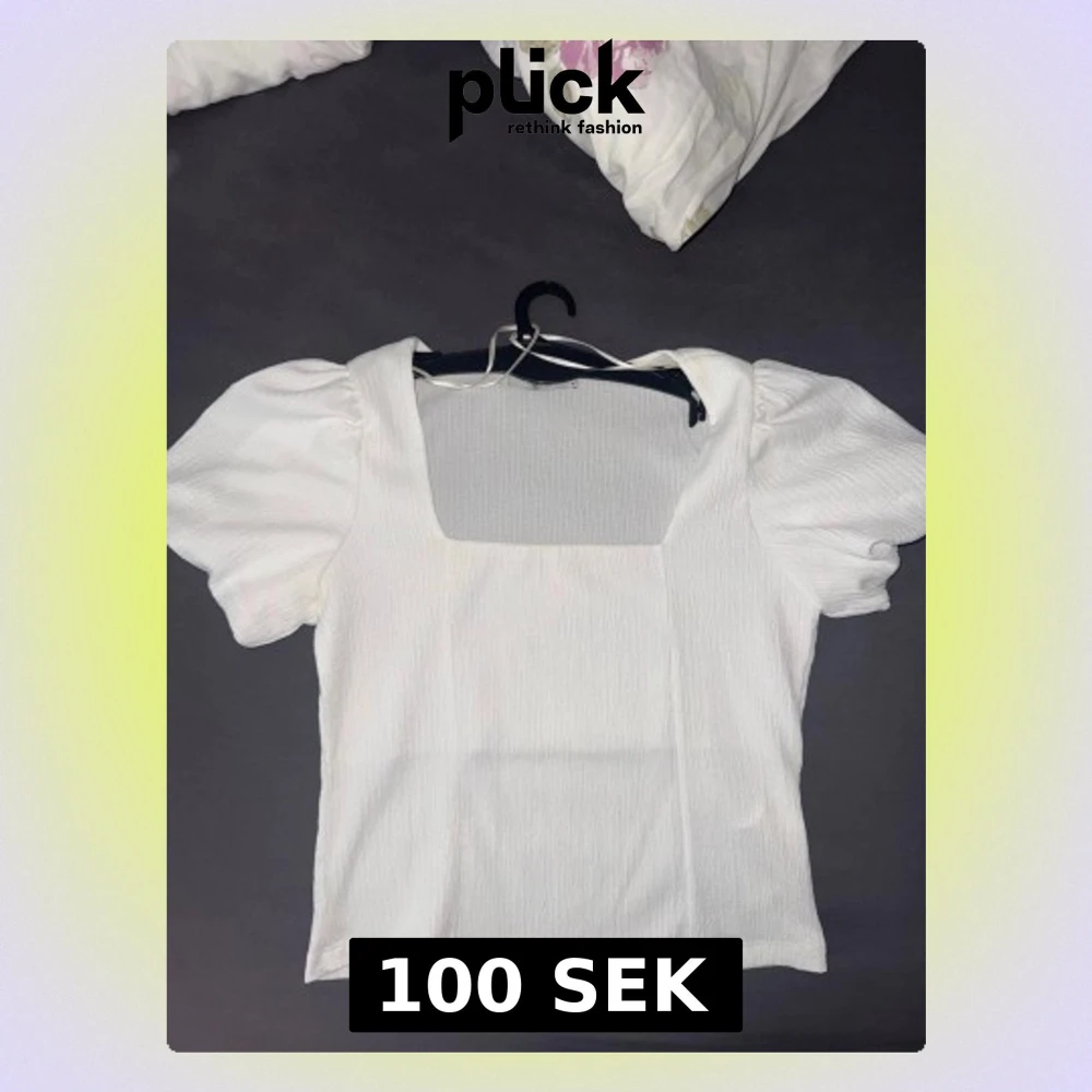 Säljer en vit topp med puffärmar och fyrkantig ringning. Toppen har en lätt strukturerad yta och är tillverkad i ett mjukt material som känns bekvämt mot huden. Storlek M men passar S