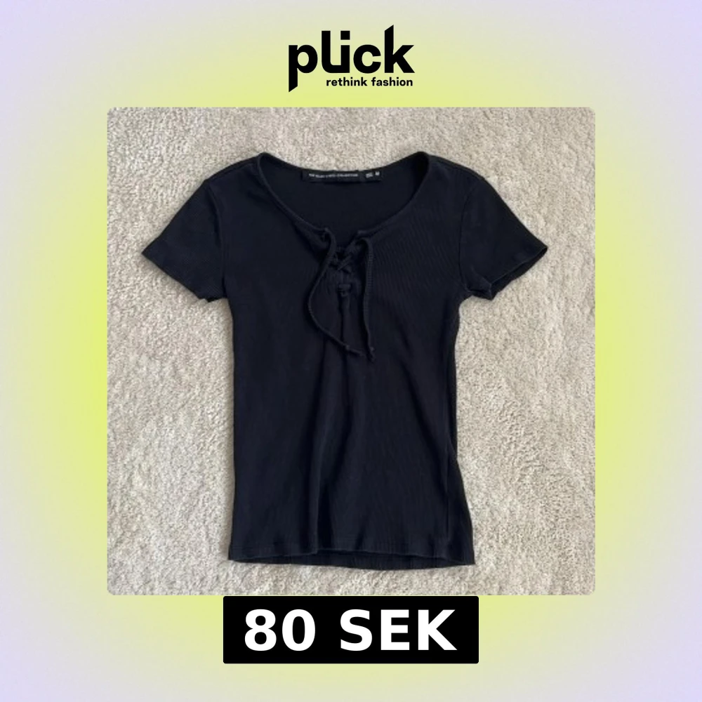 Svart ribbad topp från lager 157 i storlek M. Toppen har korta ärmar och snygg snörning framtill vid halsringningen. Materialet är stretchigt och sitter tight.