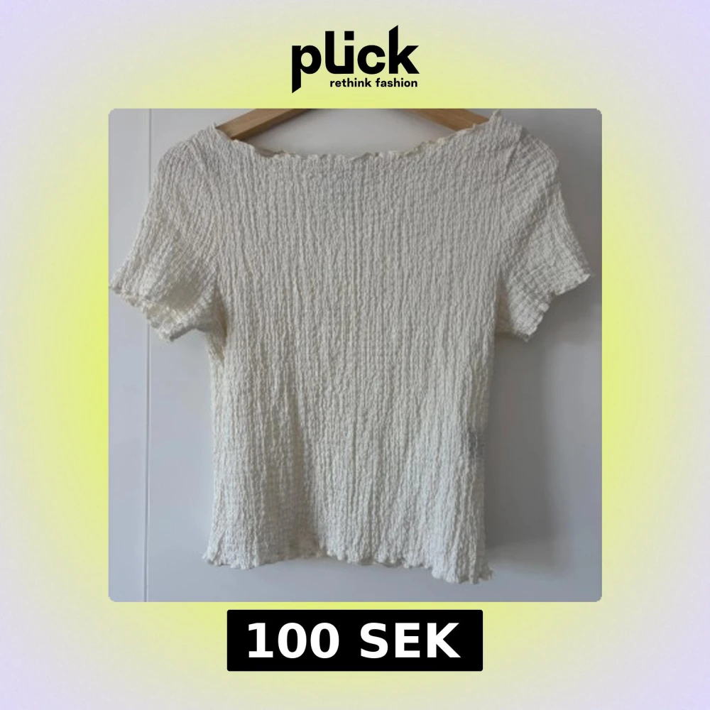 Säljer en söt vit topp med ribbad struktur och korta ärmar. Toppen har en lätt croppad passform och vågig kant vid halsringning och nederkant. Perfekt till sommaren och enkel att matcha med olika outfits. Den är i storlek M men skulle påstå att den snarare är S i passform.