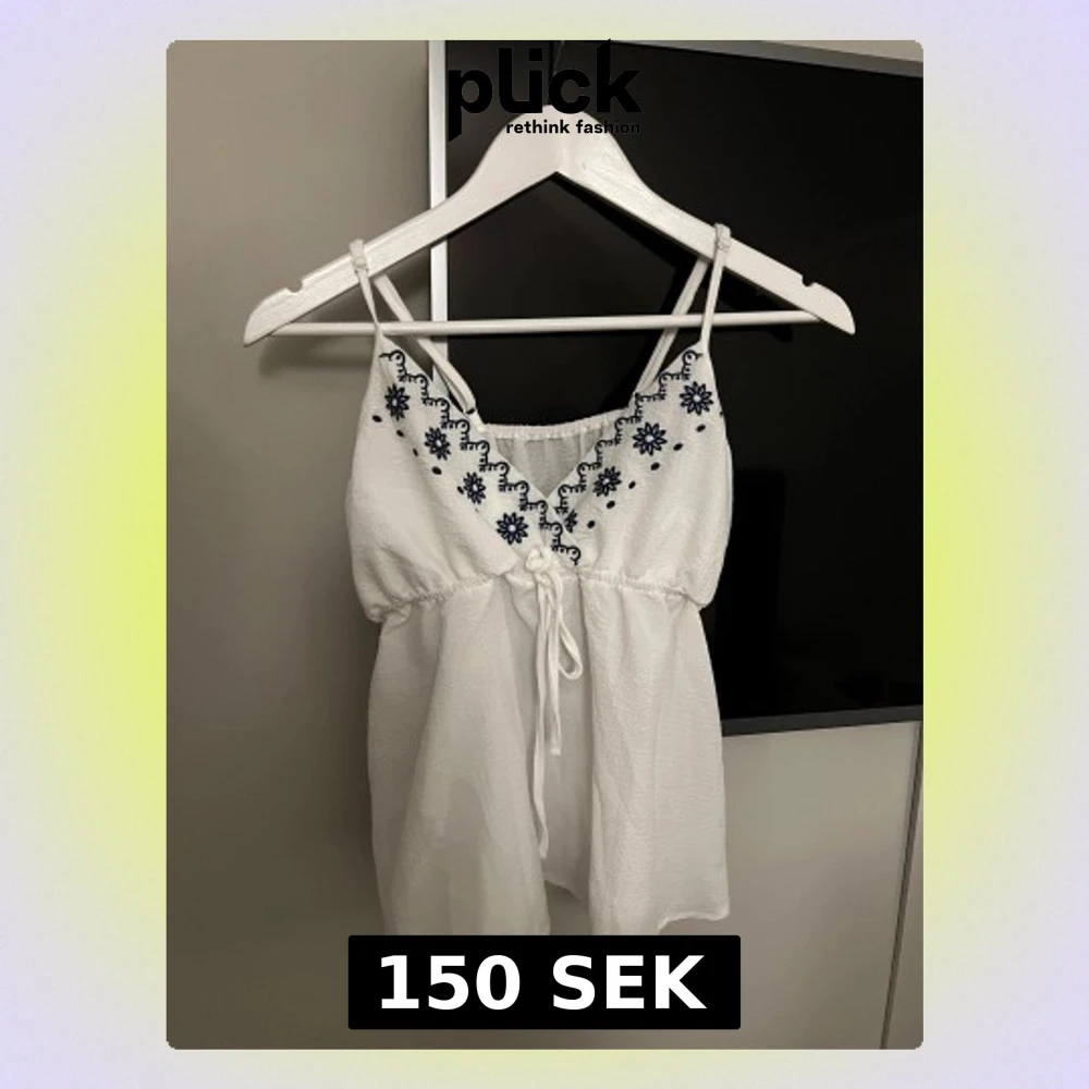 Säljer en söt vit linnetopp med tunna axelband och blå broderade blommor längs v-ringningen. Toppen har knyt i midjan och är tillverkad i ett lätt, luftigt material som passar perfekt för varma dagar. Stilren och fräsch look med fina detaljer.