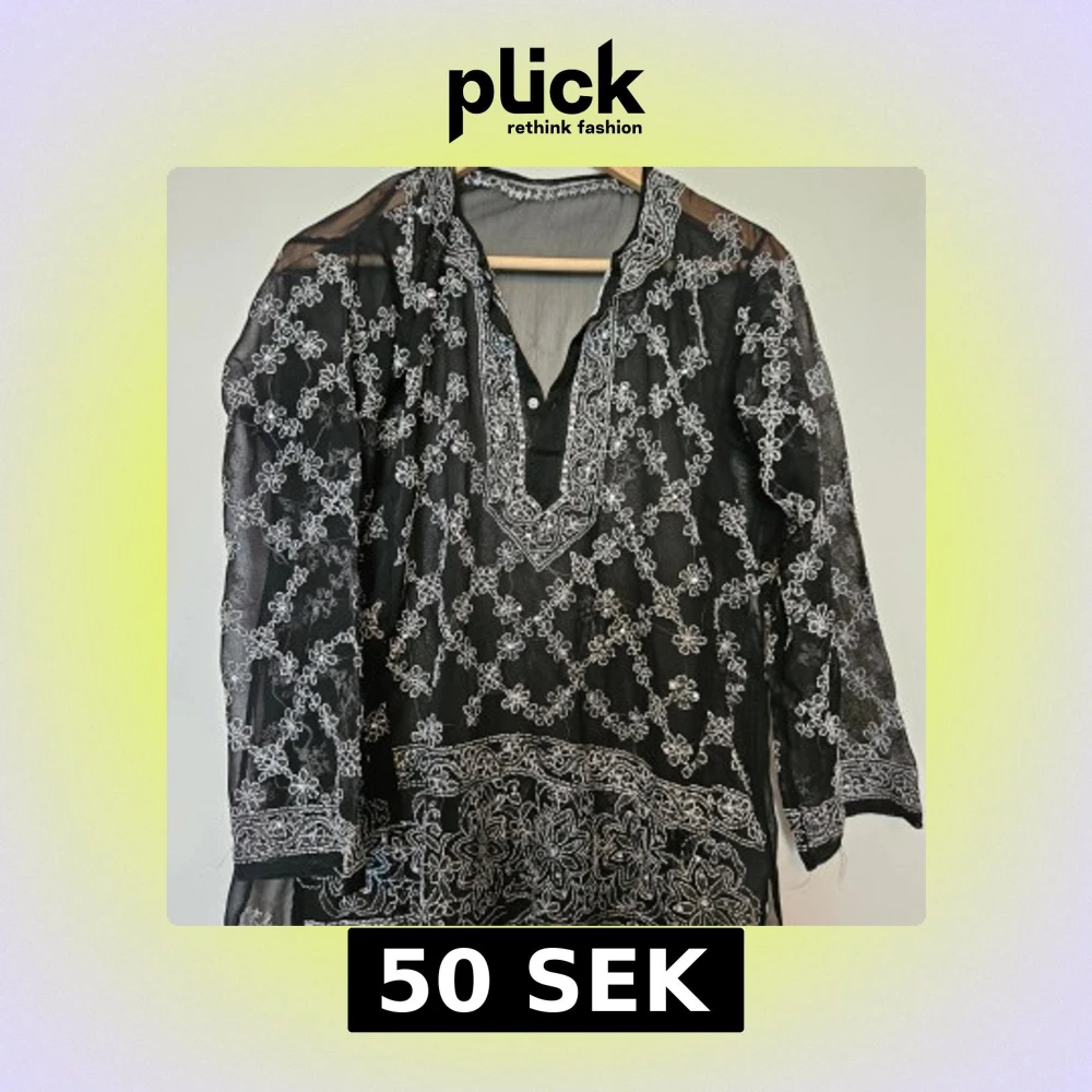 Säljer en transparent svart blus med vita broderade blommor och dekorativa detaljer runt halsringningen. Blusen har v-ringning med knapp och trekvartsärmar. Perfekt för dig som gillar unika och luftiga plagg med snygga broderier.
