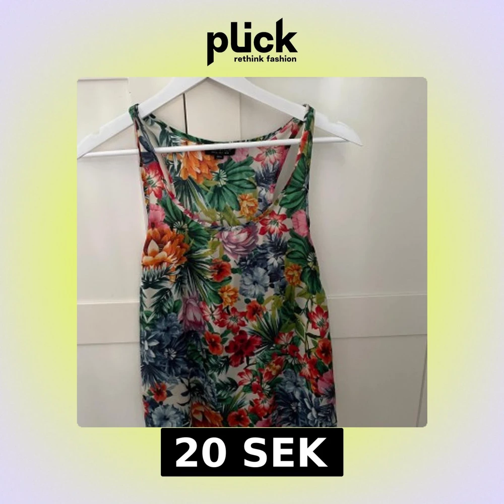 Säljer en superfin linnetopp med tropiskt blommigt mönster i grönt, rött, orange, blått och rosa. Toppen är ärmlös med rund halsringning och har en luftig känsla, perfekt för varma dagar.